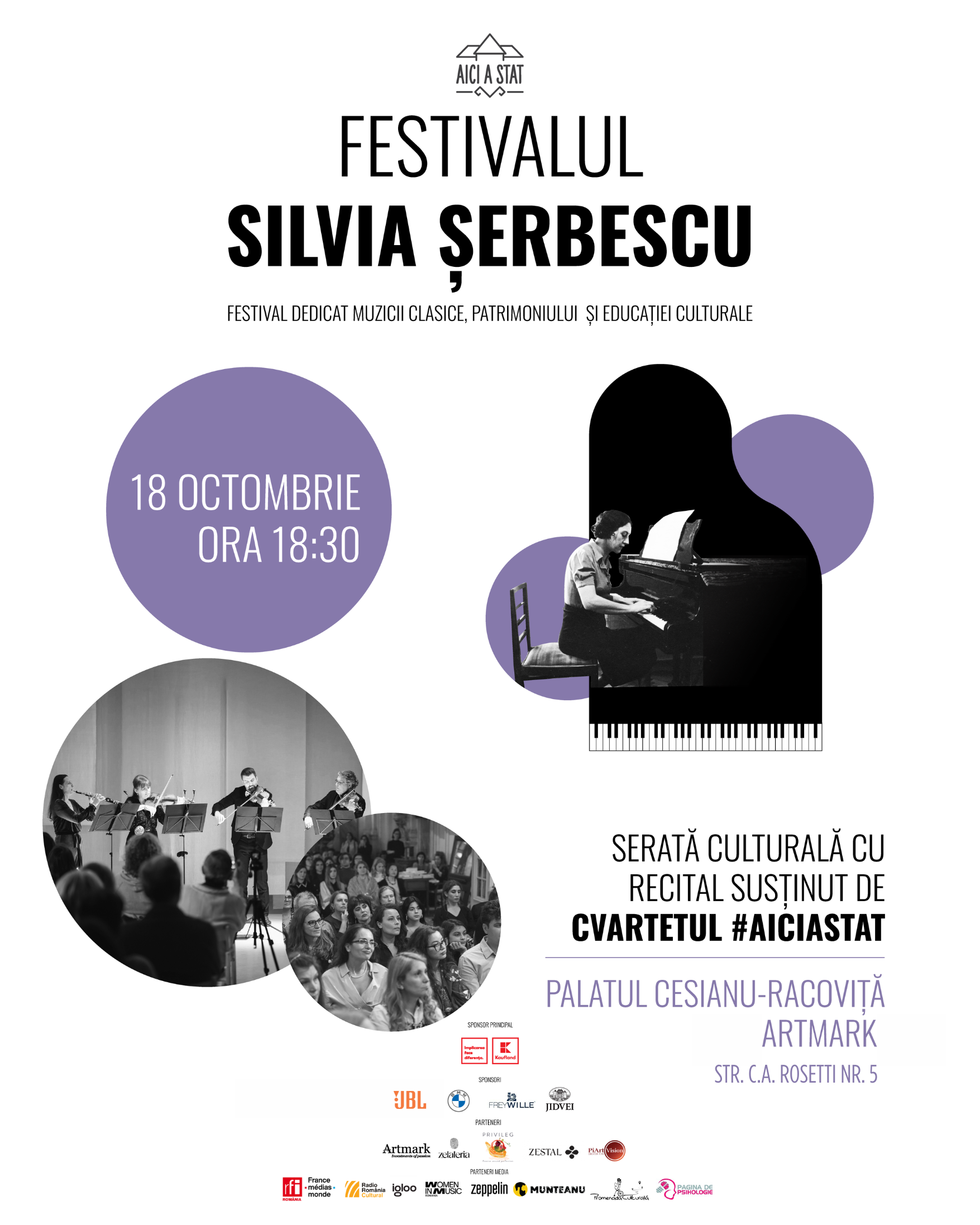 Asociația culturală „Aici a stat” este onorată să vă invite pe 18 octombrie la ora 18:30 la o serată culturală cu muzică clasică la Palatul Cesianu-Racoviță (Artmark), ultimul eveniment muzical din cadrul Festivalului Silvia Șerbescu. Continuăm să creăm atmosferă de poveste în case istorice și să le transformăm în spații alternative de concerte clasice. Muzica clasică se va împleti cu fragmente despre viața Silviei Șerbescu și cu povești despre lucrările expuse în palat în cadrul licitației de toamnă. Festivalul Silvia Șerbescu este dedicat anului comemorativ Silvia Șerbescu – 60 de ani, în onoarea uneia dintre cele mai influente pianiste ale secolului XX din România, o figură vizionară, talentată, inconfundabilă.