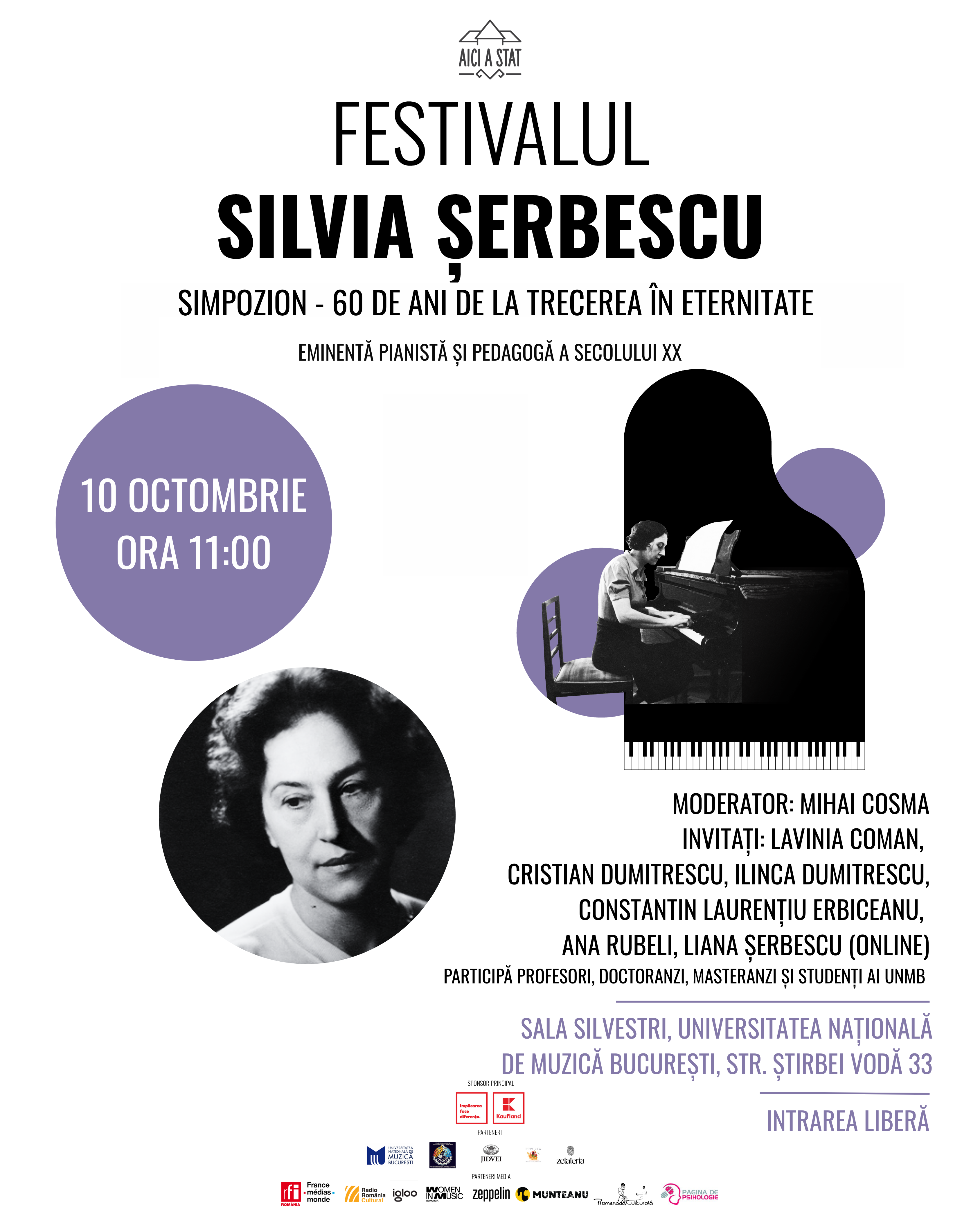 Asociația culturală Aici A Stat vă invită la un simpozion in memorian Silvia Șerbescu la Universitatea Națională de Muzică din București, în Sala Silvestri, în data de 10 octombrie, la ora 11:00. Simpozionul va aborda subiecte legate de viața și personalitatea Silviei Șerbescu, onorând-o pe Silvia Șerbescu drept eminentă pianistă și pedagogă a secolului XX. Moderator va fi prof. Mihai Cosma, iar vorbitori vor fi Lavinia Coman, Cristian Dumitrescu, Constantin Laurențiu Erbiceanu, Ilinca Dumitrescu, Ana Rubeli și Liana Șerbescu, fiica Silviei Șerbescu. Vor fi prezenți profesori, studenți, masteranzi și doctoranzi ai UNMB. Intrarea va fi liberă în limita locurilor disponibile.